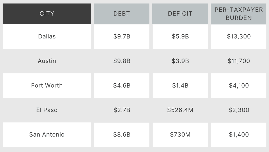 Of these 75, Truth in Accounting (TIA) found that 54 are “Sinkhole Cities.” That means these cities didn’t have enough money to pay their bills. Five of these 54 sinkhole cities are in Texas. TIA figured out each city’s total debt, its budget shortfall, and how much of that deficit each taxpayer owes.