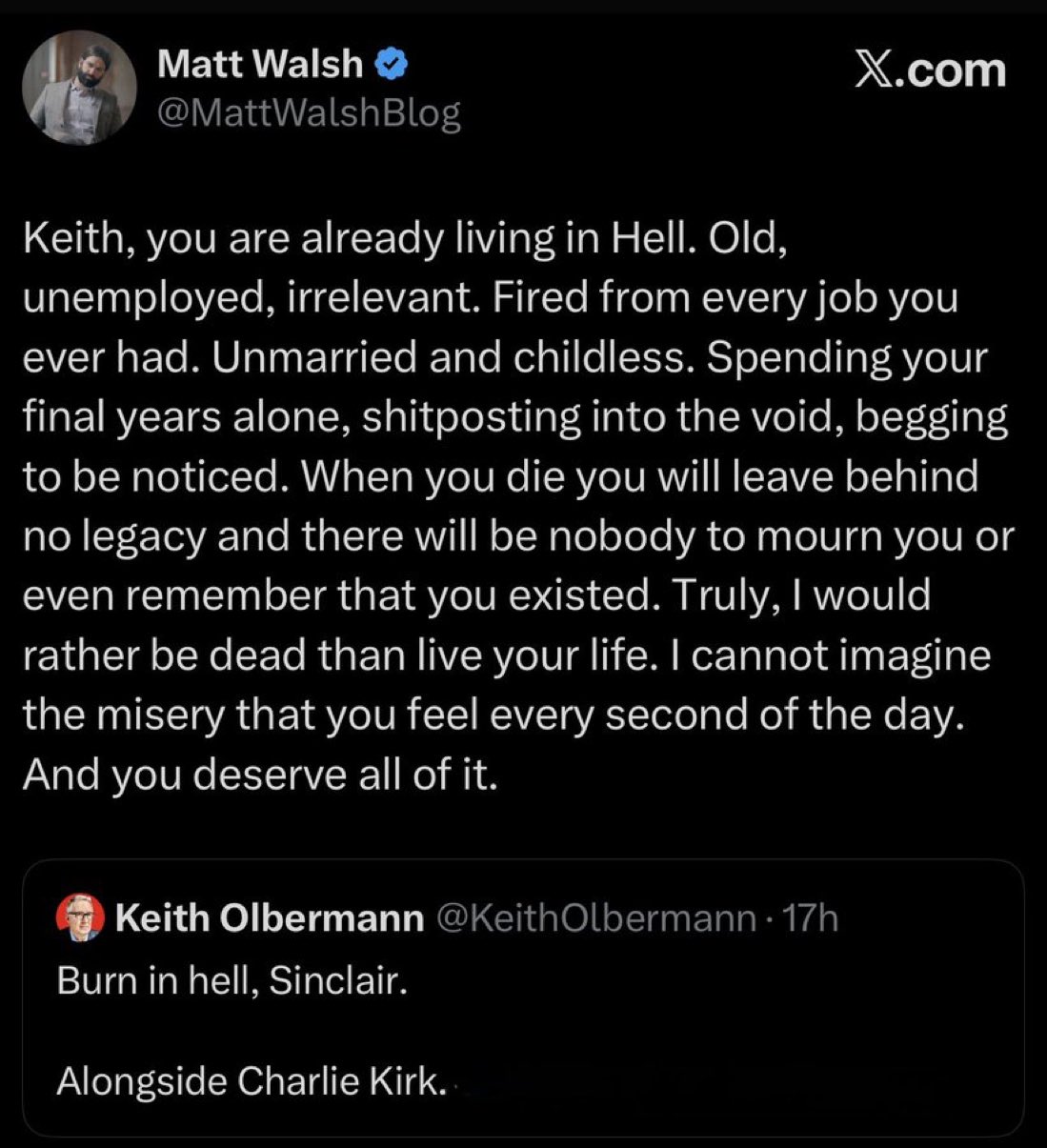 “Burn in hell, Sinclair,” Olbermann wrote on X. “Alongside Charlie Kirk.”