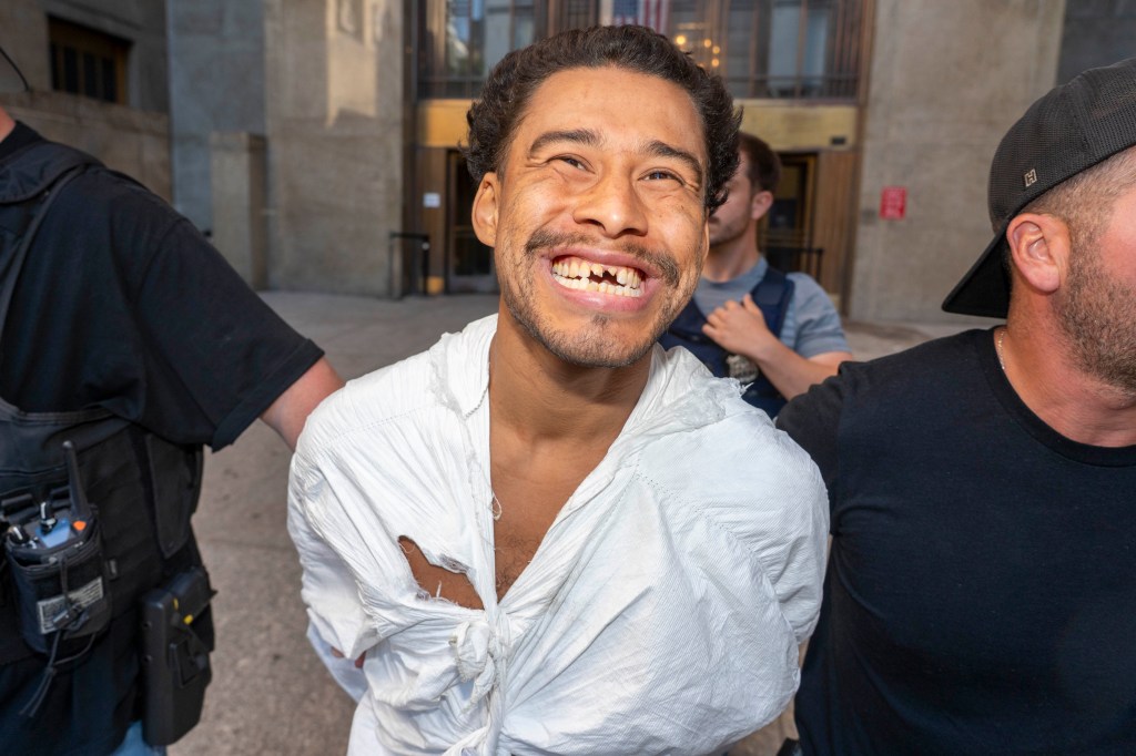 He said the unhinged stranger sucker punched his glasses off his face after he tried to shoo the maniac from an event for troubled kids.