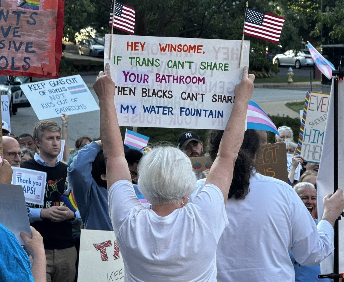 ‘Hey Winsome, if trans can’t share your bathroom, then Blacks can’t share my water fountain,’ the sign reads.