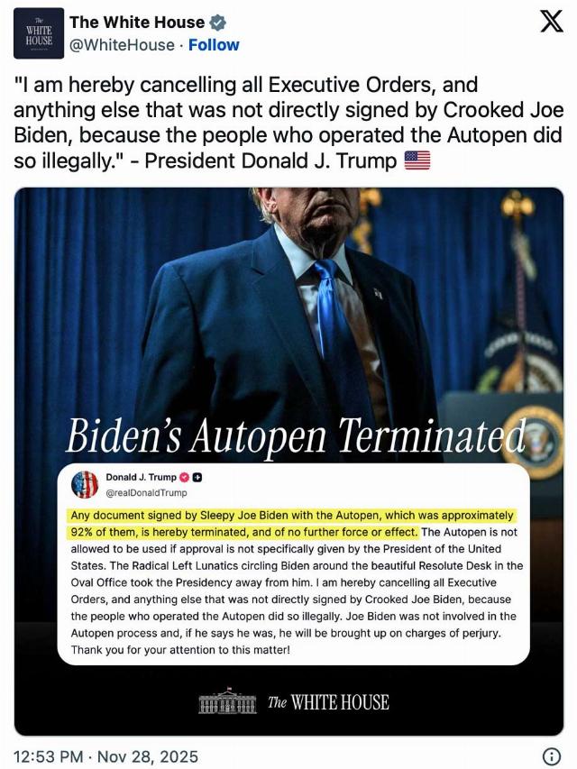 President Donald Trump announced on Friday he is terminating all documents allegedly signed by former President Joe Biden with the autopen.