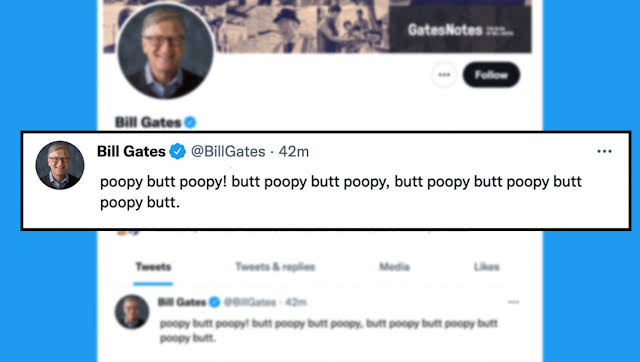 “Poopy butt poopy butt, poopy poopy butt butt,” read a subsequent tweet by Bill Gates.