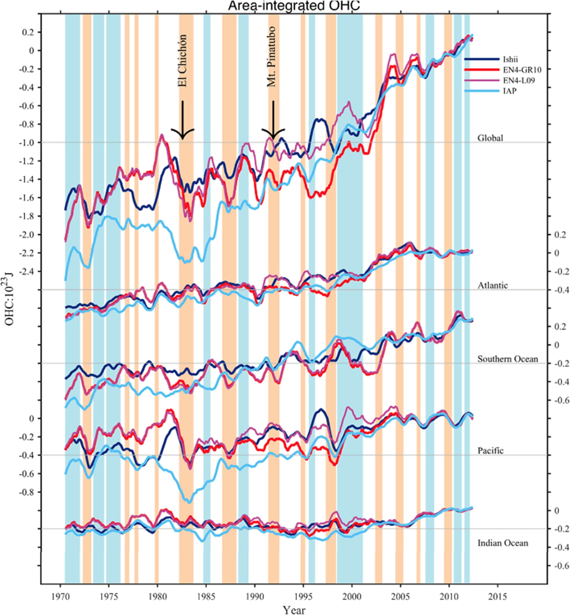 Ocean heat content increase globally (top frame) and in four ocean basins (bottom frames). Illustration: Wang et al. (2017), Climate Dynamics