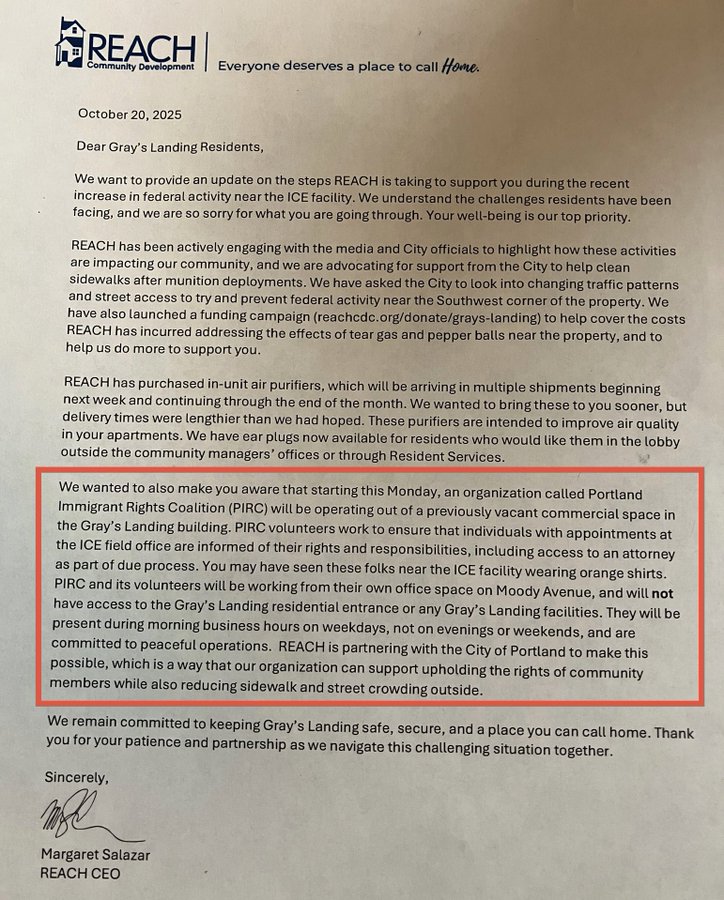 A formal letter dated October 25 addressed to Gray's Landing Residents from REACH, signed by Margaret Salazar, details updates on community engagement, media involvement, cleaning efforts, funding for street access, purchase of air purifiers for installation in apartments, and collaboration with Portland ICE for volunteer rights training and support services in the building.