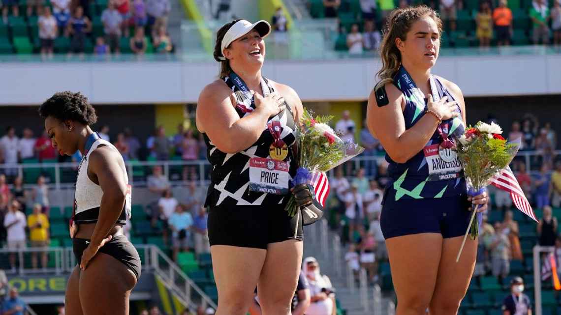 Berry's reaction to the "Star-Spangled Banner'' was as notable as anything on the track on a blazing-hot Saturday, the second-to-last day at U.S. Olympic trials. With temperatures reaching 101 degrees (38 Celsius) on the field, DeAnna Price won the event with a throw of 263 feet, 6 inches (80.31 meters), which was nearly 7 feet longer than Berry's throw. Price broke the meet record on four of her six throws, and the last two of those throws also broke the American record.