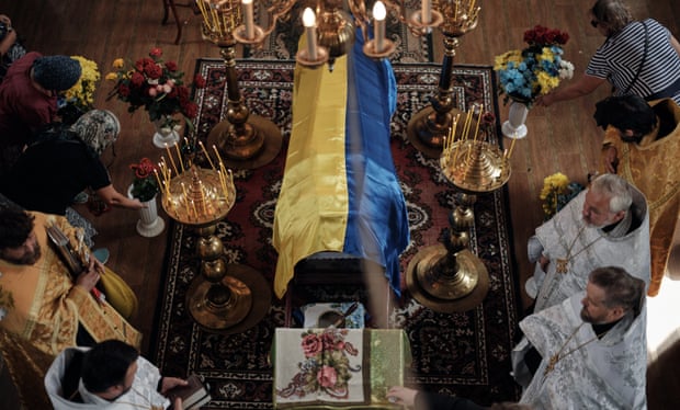 The funeral of Ukrainian F-16 pilot Oleksiy Mes takes place on 29 August. Photograph: Libkos/Getty Images