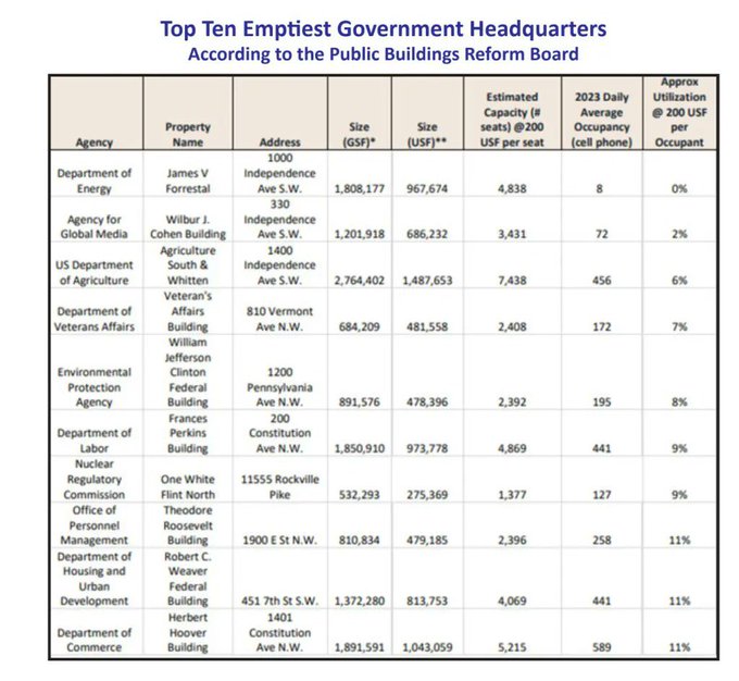 Government office buildings have an occupancy rate of only 12%, yet the government spends $16 billion a year to operate them. Even the head of the General Services Administration, which manages federal real estate, works from home in Missouri.