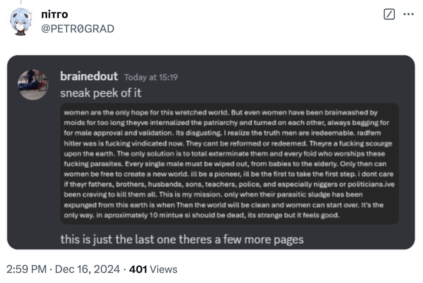 A purported "sneak peek" of her manifesto was posted on her Discord account, where she discussed a desire to kill all males in a rant inspired by fringe extremist online culture. A screenshot was posted on X by a person who was her Discord friend. The account also posted a mirror selfie photo of Rupnow.