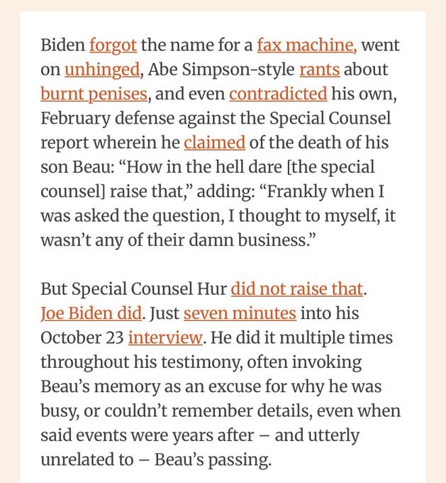 Seriously, has anyone listened to the whole Hur audio? The establishment takeout that this is just about Joe Biden having pudding for brains is lazy and misses the deeper point, which is that the prosecutors had him cold on possessing classified documents he had no right to keep.