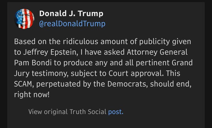 And, I repeat, Trump is not not saying the Epstein operation is a hoax.  Trump is saying the current unhinged OBSESSION with Epstein is the hoax, and it’s designed to distract you, derail Trump’s support, and sow doubt within our ranks.  He's further saying he knows who the obsessed are.