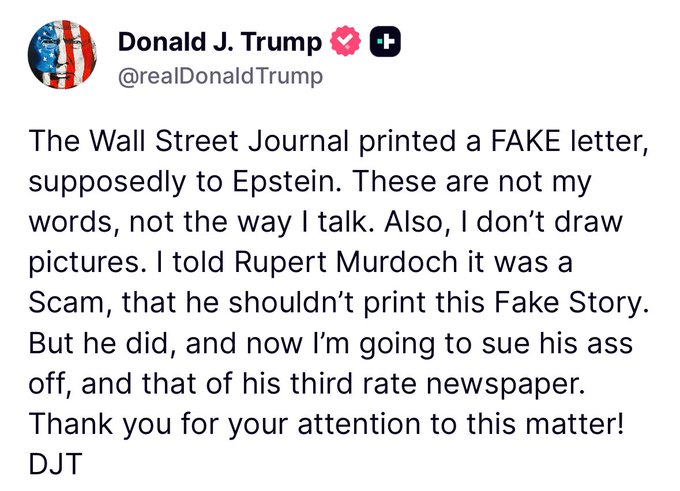 No, Trump did not draw porno pictures for Epstein. DJT is now suing the Wall St. Journal for libel for claiming he did - and I suspect he'll get another big settlement, as happened with ABC and CBS.