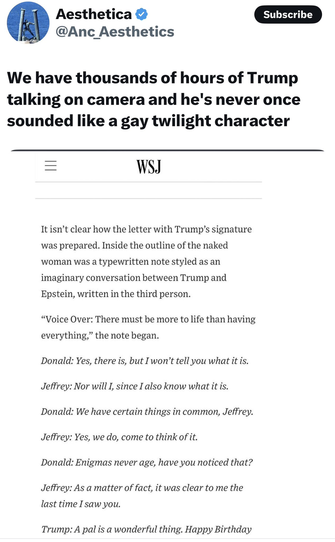 The Wall Street Journal reported that Trump purportedly sent Epstein a birthday card for his 50th birthday in 2003. It was “bawdy,” accompanied by a doodle. The paper says they have the letter but won’t publish it. It’s the Russian collusion hoax all over again. While the MAGA movement was splintered online over how the Trump administration handled the Epstein files, it quickly reunited since not even the most ardent critic of the Trump Justice Department could stomach this piece of trash reporting.