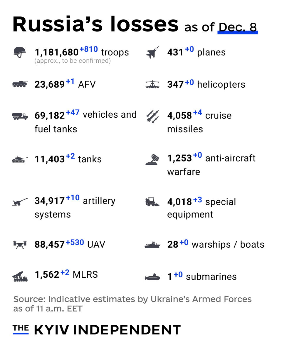 Russian officials continue to falsely frame recent Russian advances on the battlefield as an indication that a Russian victory is imminent and inevitable. Russian Presidential Aide Yuriy Ushakov stated on December 3 that Russian forces’ successes had a “positive impact” on the December 2 meeting between Putin and a US delegation in Moscow and that Russian advances have given the West a “more accurate assessment” of the “paths to achieving” peace in Ukraine.