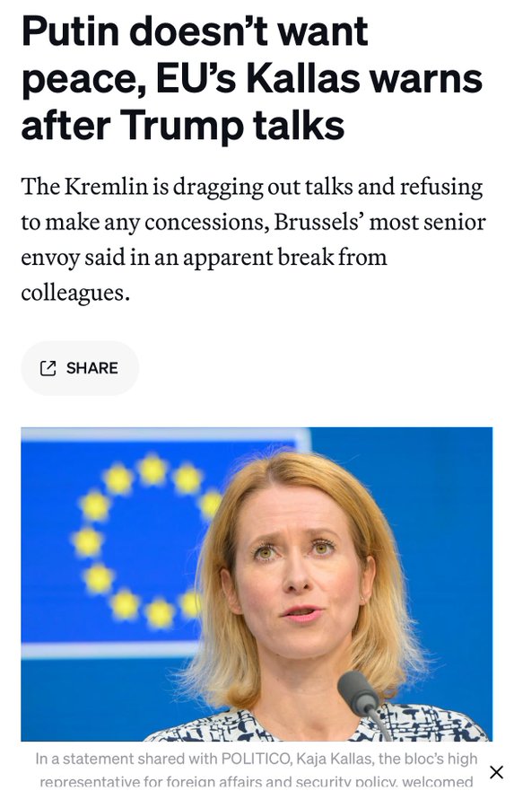 EU foreign policy chief Kaja Kallas: Putin left Anchorage without any commitment to stop the killings. “Russia has no intention of ending this war soon—Moscow launched new attacks even during the talks. The US has the power to force serious negotiations. Europe will keep supporting Ukraine and push for a 19th sanctions package.”