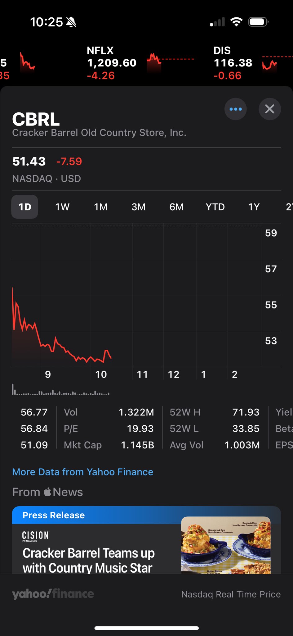 The stock, down 16.47%, is on pace for its worst five-day stretch since Feb. 14, when it dropped 17.7%. Cracker Barrel’s stock fell to $52, down more than $6, or about 11%, marking its lowest level since mid-June. Shares gained slightly to $53.48 by the afternoon.