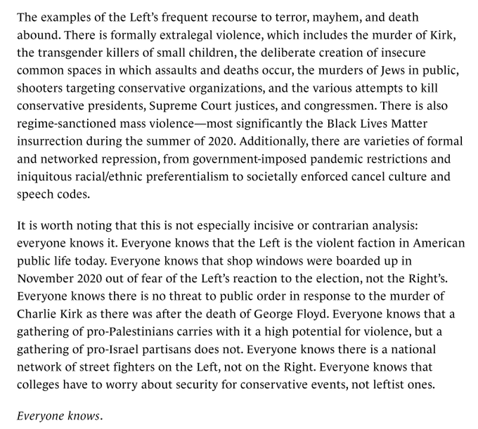Fact 2. Two days later, tens of millions of Americans watched a video of Charlie Kirk get murdered speaking to college students. Millions of these people knew who Charlie was; millions of them didn’t. Upon seeing the video, however, these normal Americans from across the land and across the political spectrum agreed that he was the victim of a terrible, fundamentally unjustifiable crime, and their hearts broke in sympathy for his family. Good people who had never even heard the name Charlie Kirk before wept.