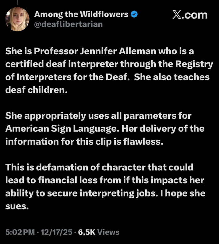 Who has said she was a fake interpreter?  I'm pretty plugged into the ASL community, and haven't heard a peep about this. Also, I was half-watching a clip of the news conference with the volume off and I was able to understand the gist of it even though I was only half paying attention.
