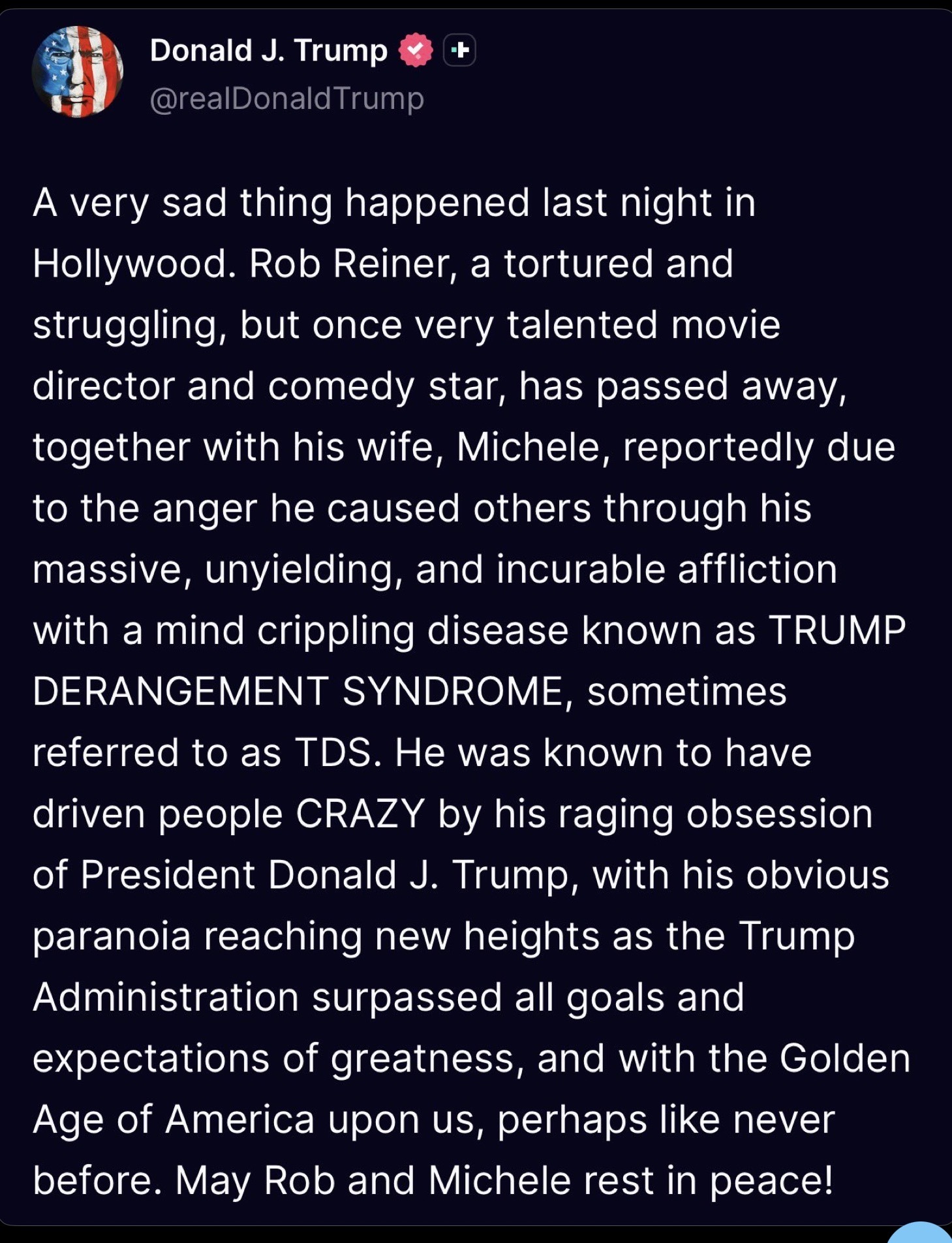 As America reels from this elite Hollywood betrayal, Trump's triumphant message rings clear; Wake up and stop the radical left's madness before it claims more lives. Democrats like Rob Reiner preach tolerance while their own backyard erupts in violence, proving their agenda is a death trap disguised as compassion. With Trump at the helm, we'll crush this one world woke takeover, safeguard our values, and ensure tragedies like the Reiner murders become relics of a failed liberal era, making America safe and great again.