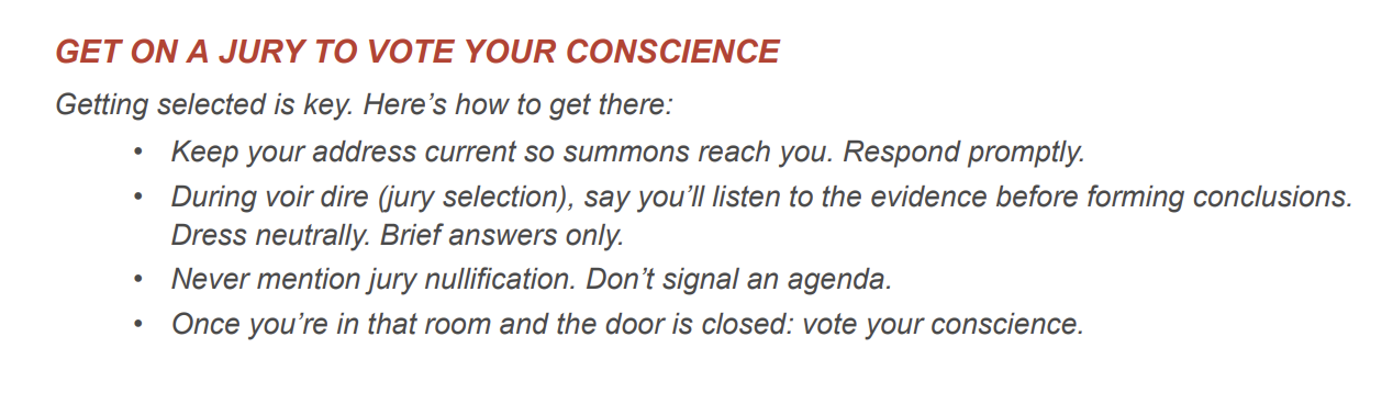 The group tells attendees to keep their addresses current to ensure they receive summons. Then, during the jury selection process, it advises them to "Never mention jury nullification," "Don't signal an agenda," and "say you'll listen to the evidence before forming conclusions." Once selected, the group tells its trainees to vote "not guilty" for any reason.